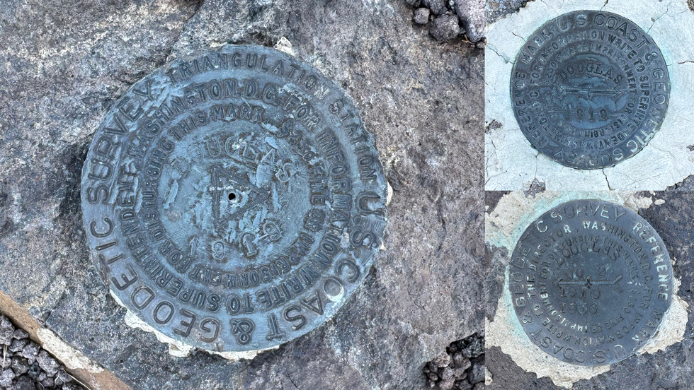 A trio of Douglas-stamped marks on the summit. RM#2 was set later (1936) than the 1919 BM and unnumbered No. 1 RM. Apparently there's also an Azimuth disc on the far end of the summit plateau that we missed (also set in 1936). The summit cairn is historic, also having been built by the 1919 survey team (don't knock this one over BobP!).