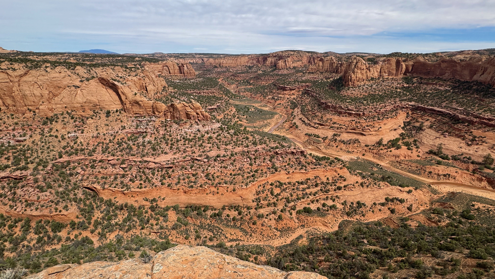 Upstream view from Tsegi Point. Long Canyon. Navajo Mountain rises above the horizon 30 miles away.