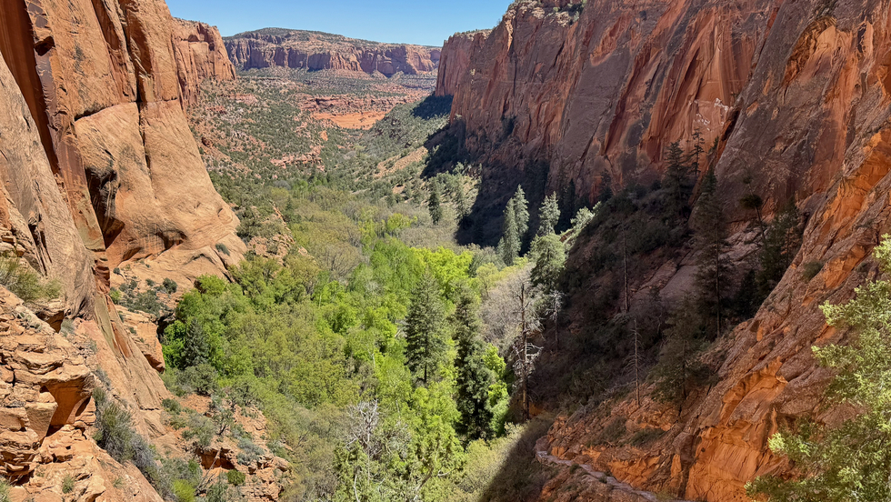 The "upside down mountain" that is the magnificent Betatakin Canyon. A stretch of stairs visible at the bottom of the photo.