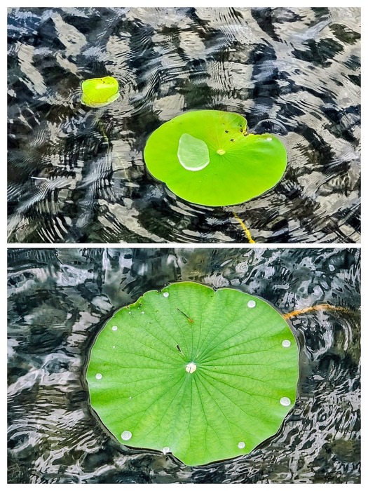 * **Water Repellency:** You can see perfectly round water droplets on the surface. This is due to the **lotus effect**, where microscopic structures on the leaf surface make it extremely water-repellent (ultrahydrophobic).
