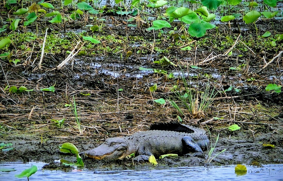 * **American Lotus:** Numerous green, circular leaves (lily pads) are scattered across the mud and shallow water, some standing on thin stalks.