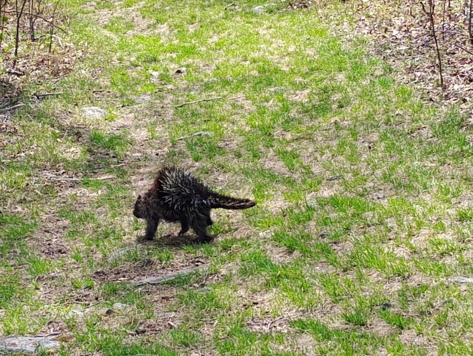 He finally raised his quills after I made a noise. Still just casually walking.