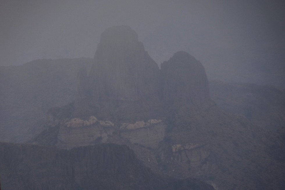 12:02 pm - really, that's Weaver's Needle. I am sure someone knows what the white membrane is... but I don't. It shows up pretty well through the cloud.