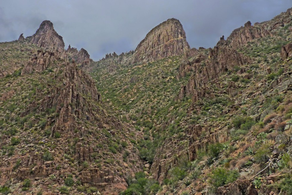2:18 pm - is this what they mean by climbing up the middle of the beast. You can see from where we came (wow!) from the saddle in the middle of the picture.