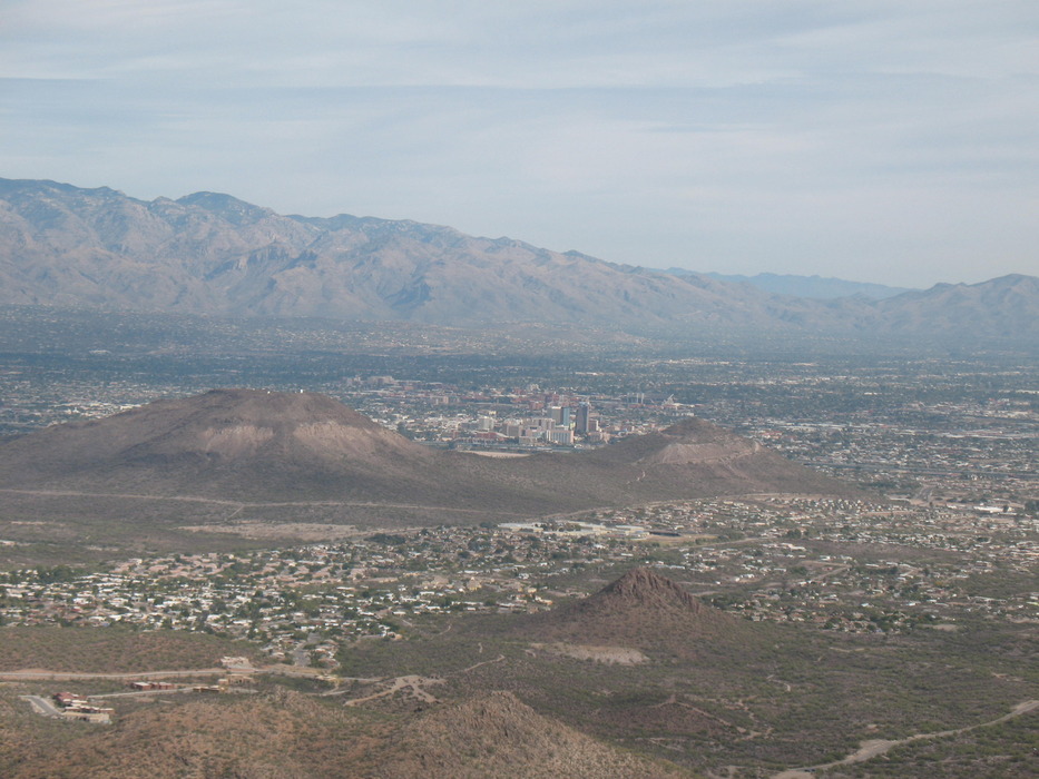 Tumamoc and A-Mountain (Sentinel Peak) framing downtown Tucson. Reddington Pass in the distance.