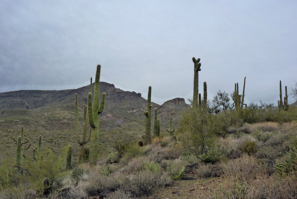 Here I liked how the saguaros contoured against Elephant Mountain. The front part of the Mountain is called the Fortress. There are defensive ruins on top.