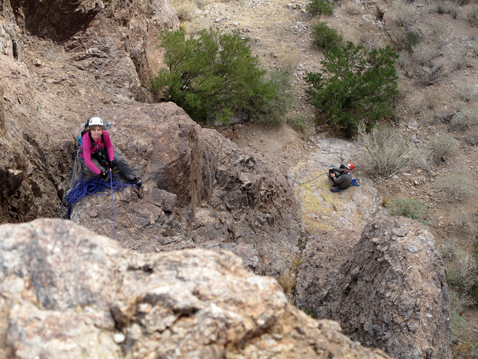 I'm on the top of the 1st pitch, belaying the lead climber up the 2nd pitch and will turn around to belay the 3rd climber up with the rope that I trailed behind me. Curtis is waiting at the base of the climb.