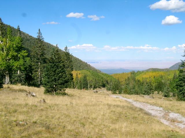 The inner basin view looking back down the trail toward Lockett Meadow and beyond.