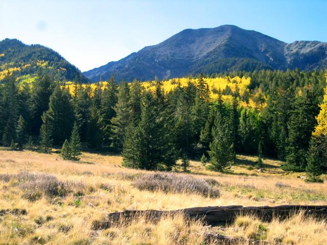 Arizona's highest point juts above fiery aspens as seen from the inner basin.