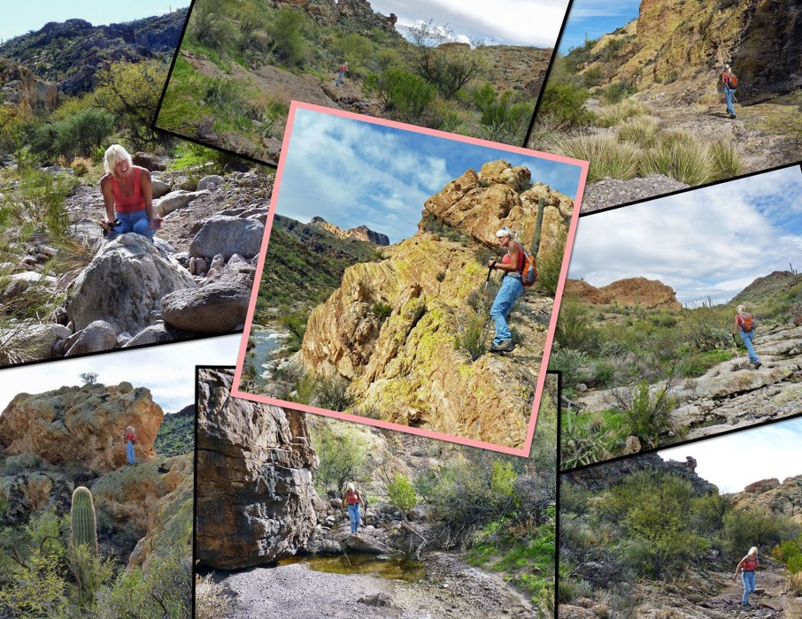 can't forget "KAT": Upper Left - at our lunch spot trying to set up the group photo but instead I got a photo of her, ha!, Upper Middle - in the wash of the Rough n Ready, Upper Right - walking through the wash bed not too far from the Wave, Middle Photo - on a lower level of the Wave Ridgeline overlooking the wash, Lower Left - on the "Katwalk", Lower Middle - crossing a water obstacle on the Rough N Ready as we followed the wash rather than go around, Lower Right - making her way around that same bend earlier.