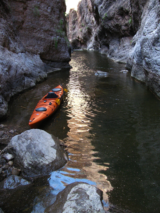Lake level was 94%. Exiting kayaks was considerably safer. Note the gravel bar behind my boat to the left. Deeper water makes this slot canyon access rather difficult.