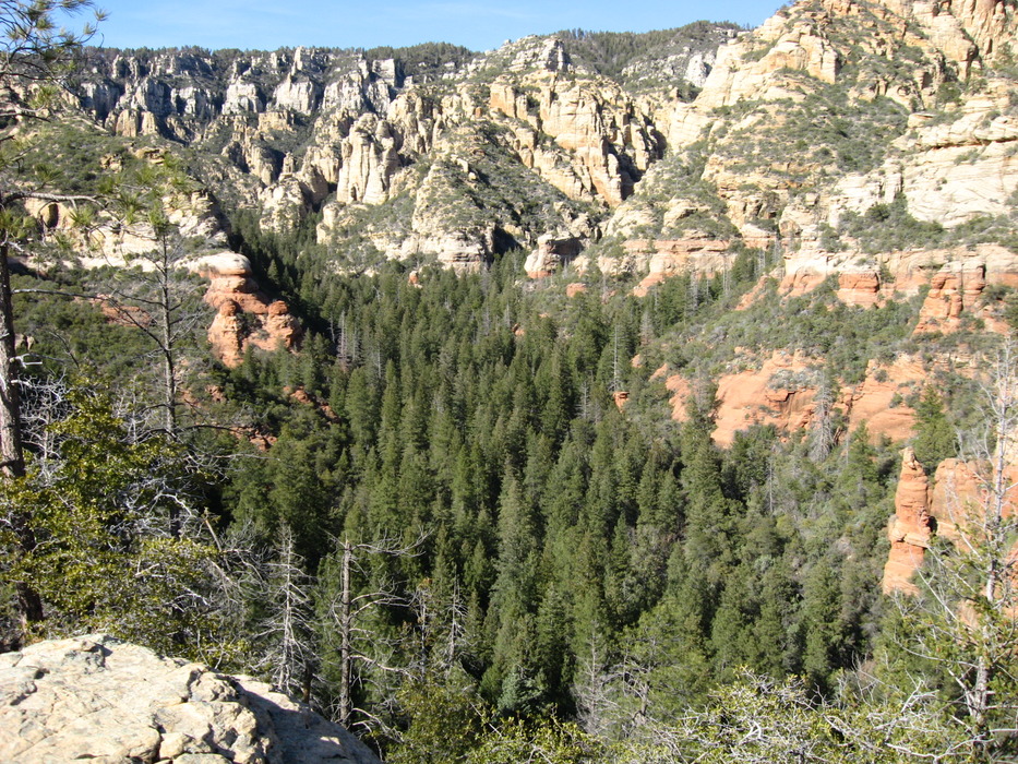 Bear Sign Valley, as I am calling it. The Bear Sign Trail continues up the valley a little way past the David Miller-Bear Sign junction. From this spot, I could hear water running in the valley and it looked like a nice shady spot to camp in. Unfortunately, after doing the Bear Sign in the Spring of 2010, I realized that this spot here offers the best views of the Bear Sign Canyon.