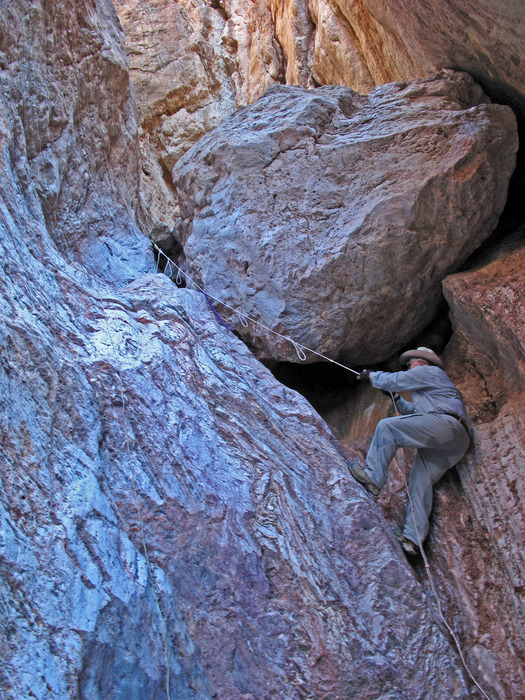 We flipped a coin and I won: Joe goes first on this 25 footer to test the rope setup for me.. (-: ... We would have had to turn-around here if this rope had not been here; It was also a good decision that I brought my personal 30ft rope to use for our day packs to pull up and down this one;