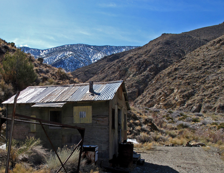 After the 1.3ml 4WD into the South Fork of Trail Canyon and after the short walk to the end of this Morning Glory Camp entrance road at 4255ft elev, is the TH-Hike Start (at way point N36.30335 W117.04780) for the 3.0ml one way hike to end at the Morning Glory high Mines; Views south;