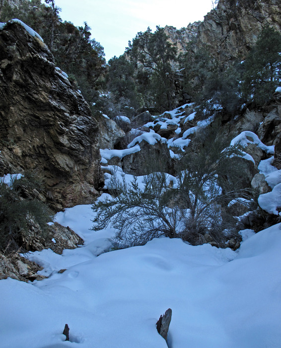 Our stopping point and turn-around location at 3:22pm at our hike highpoint for the day at 5750ft elevation (at way point N36.28477 W117.05592).. still a lot of climbing to go to exit out of this canyon at the top end, the Morning Glory high Mines at 6350ft elevation (another +600ft up from here); Pic views SW;