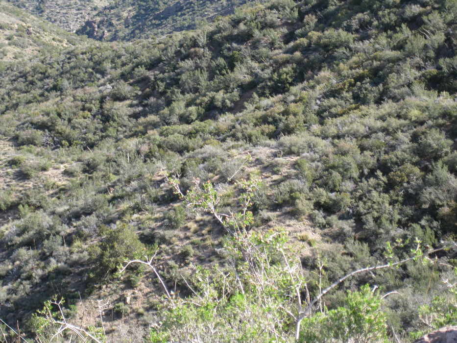 Can you spot the deer in this photo? Almost dead center. This was the most wildlife we have seen in the Superstitions in one day. A total of 6 deer. This was taken from the top of the pass looking down into Roger's Canyon.