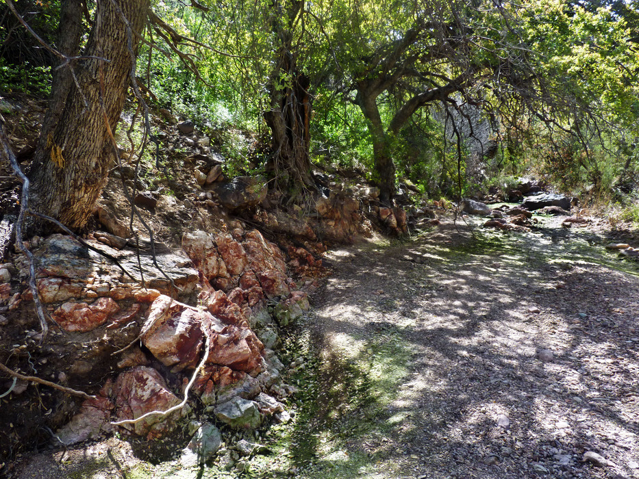 We've gone a bit east up the wash to find this shaded area with some cool rock.