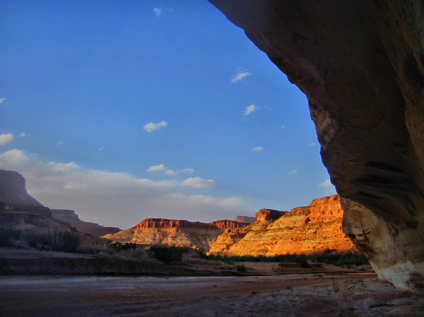 Peering around the corner, just below Poison Spring Canyon road, we had gale force winds blowing the boats backwards in the water with standing waves, etc the previous hour, beached the boats and took refuge here waiting for things to calm down