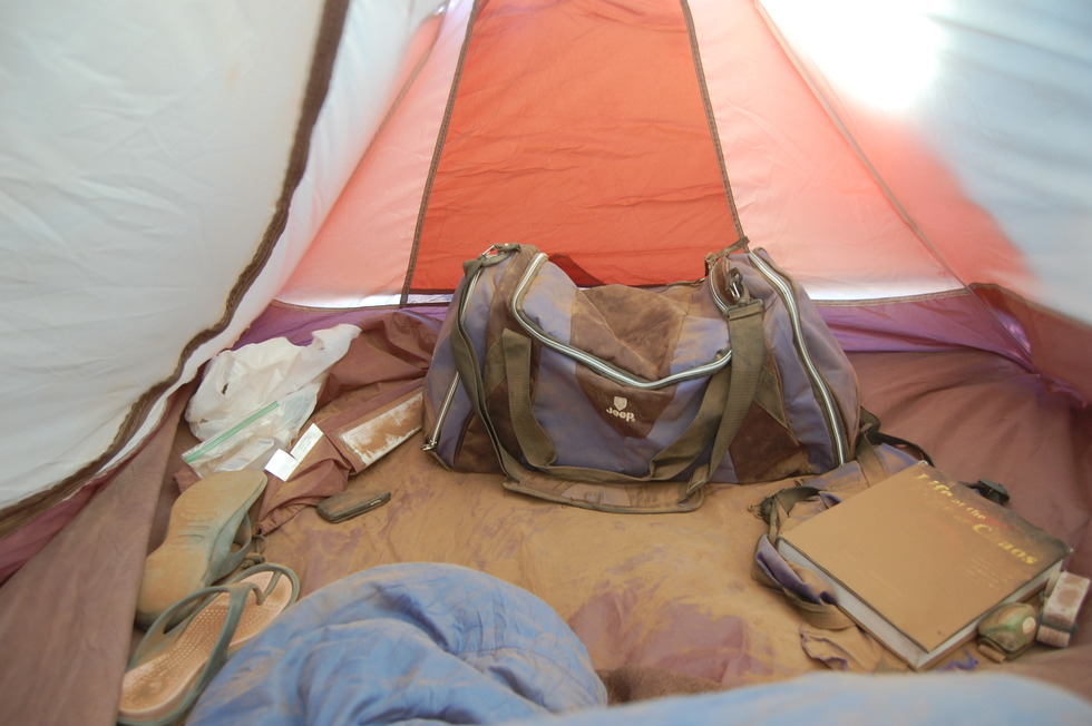 i woke up to this. the bag had more dirt on it but i had to get my camera out for this picture. the name of the book is "life at the edge of chaos." very appropriate. my face was covered as bad as the rest of the stuff in here but unfortunately i didn't think to photograph it.