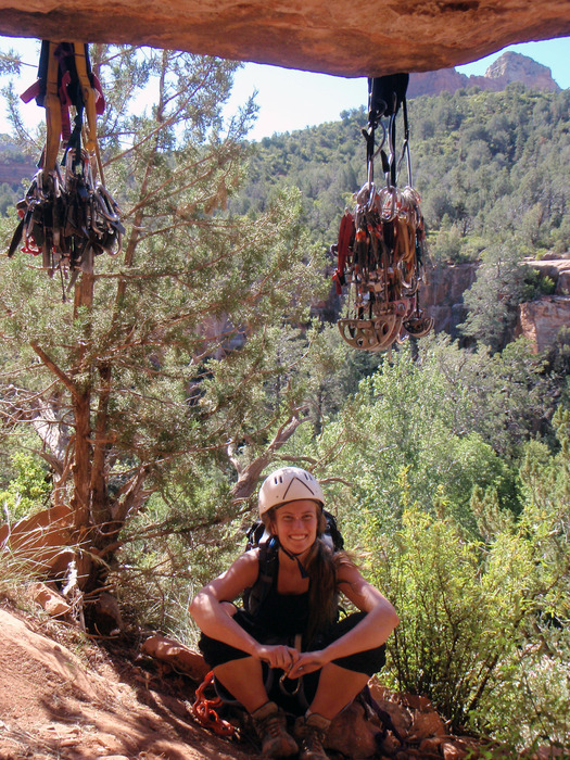 Our classroom was located under this ledge, where the gear could dangle and twinkle in the sunlight, with beautiful Sedona views in all directions. We were teased by sound of the running creek water a few hundred feet below us throughout the instruction. Can't think of a better location to learn.