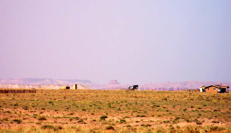 Rock Head stands out on the horizon, beyond a Navajo settlement.