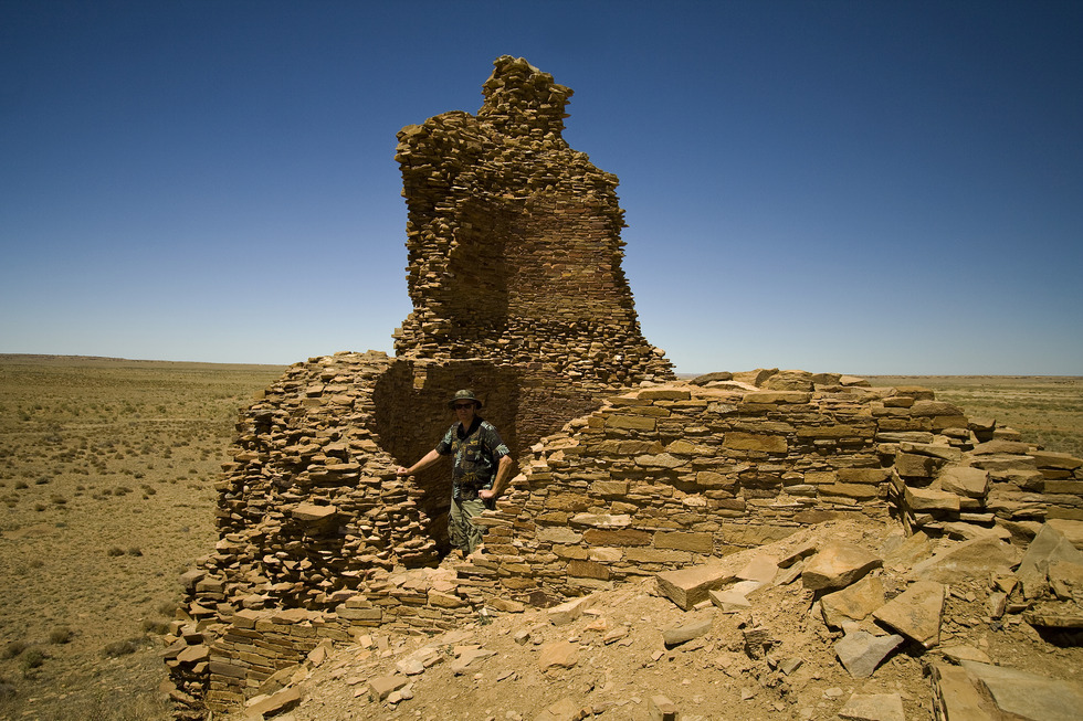 Mike captures my image while I'm inspecting the tower kiva at Kin Ya'a...