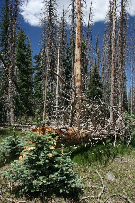 Dead trees standing up, dead tree on the ground, and the baby ready to tower above both