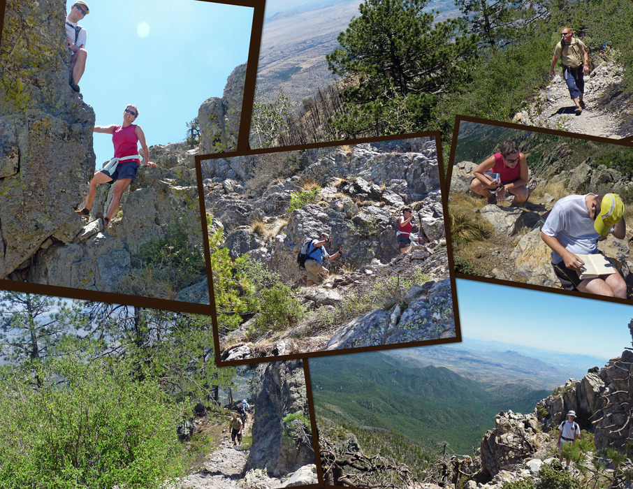 These photos are taken up and around Wrightson. Upper left - Tiffani and Mike, Lower Left - Jake is leading the way, Center - Marc is behind Tiffani as they are above me, Upper right - Jake makes his way toward the top of Wrightson, Middle right - Tiffani and Mike looking at the log book, Lower Right - Ben just below the rocks where Mike and Tiffani had climbed.