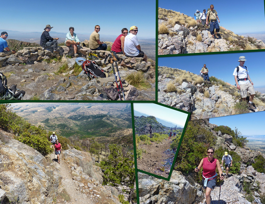 Upper left - Marc, Sheila, Wendy, Jake, Tiffani and Mike on the old Fire Lookout wall. Lower left and right - Tiffani and Mike coming up the summit stretch, Upper right - Jake and Jeff and Wendy start down from the Summit, Middle right - Ben and Jake making their way back down, Center - Wendy and Ben walking on a switchback down the mountain.