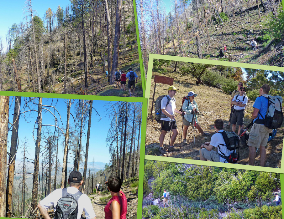 Upper left - the group making their way down the Super Trail from Baldy Saddle, Lower left - Tiffani pointing out the location of the Border Patrol balloon to Jeff, Middle left - the gang re-grouping near the tree at Baldy Saddle.