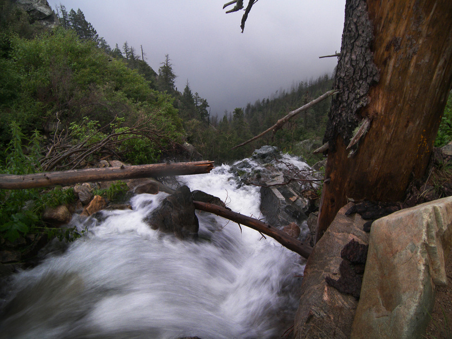 Standing in the creek at the edge of the falls. Clouds are obscuring a nice view of Marijilda Canyon.