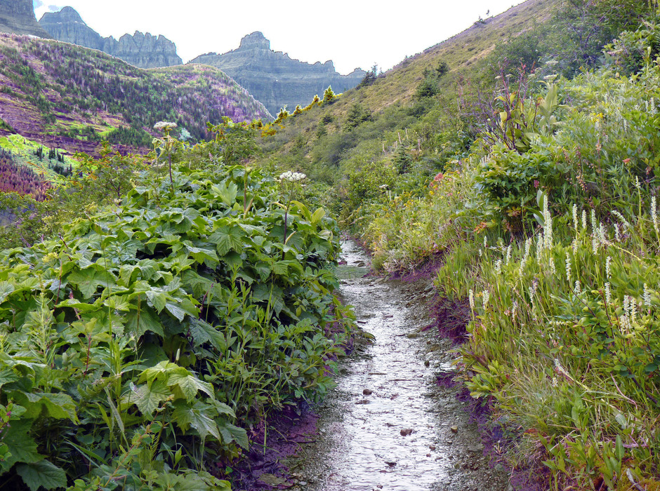 We did encounter some light misty rain but not nearly enough to get us to stop our journey. We are heading westward toward Iceberg Peak on left. On the left side of the trail is Thimbleberry mixed with some Cow's Parsnip and on the right is some White Bog Orchid.