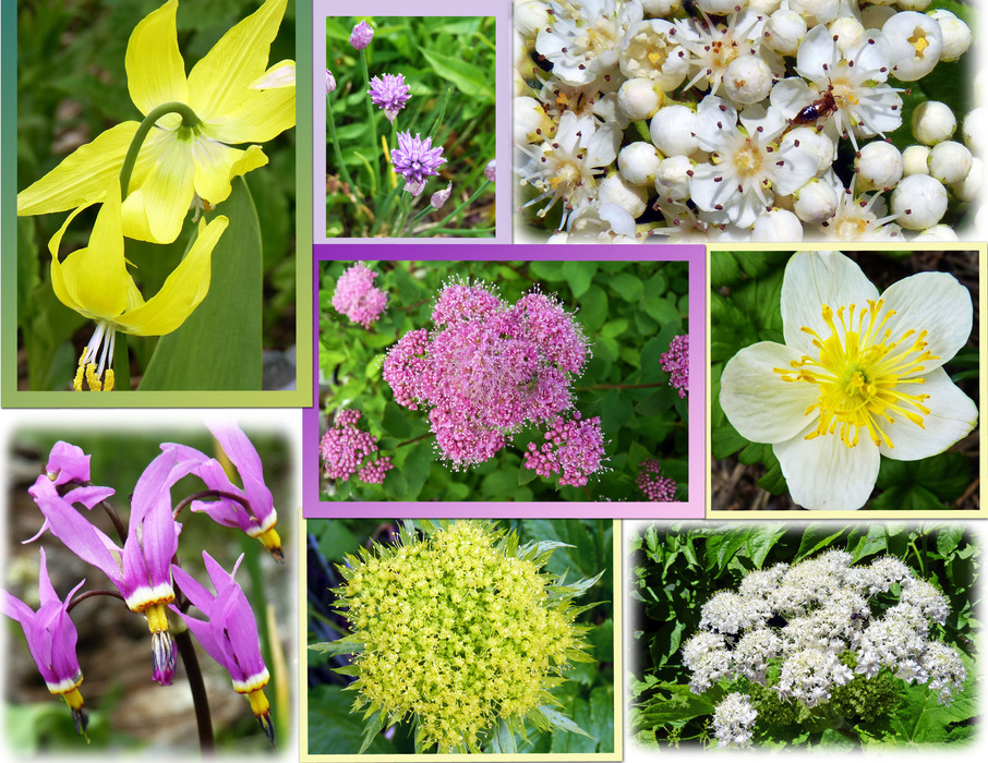 gosh, another test. Top - Glacier Lily, Wild Chives, and Western Mountain Ash, Bottom left: Few Flowered Shooting Star, Middle - Subalpine Spiraea, Globeflower - Bottom middle - Yellow Angelica, Bottom Right - Cow's Parsnip