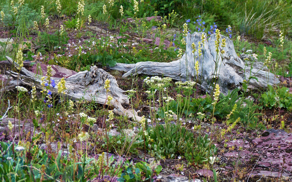 Back to the log stump and the colorful flowers (incl. Coiled Beak Lousewort? and yarrow) that surrounded it. I just couldn't quite compose the photo I wanted here. Plus it was getting a little testy weather-wise at this time.