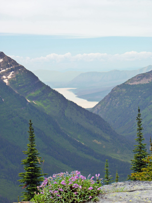 and one set of flowers on the ledge with Lake McDonald in the background. Lake McDonald is about 10 miles long and over a mile wide (472 feet deep).