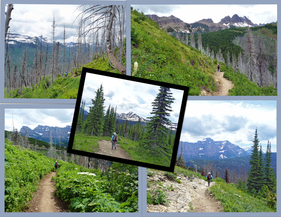 A photo collage of Ambika as we walk the Loop Trail. We are descending nearly 2400 feet in 4 miles. The middle photo is toward the top of the trail where the fire didn't reach. In that same photo is Heaven's Peak. The rest of the photos are below this area.