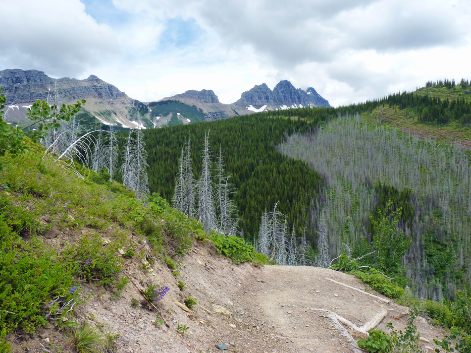This is the switchback which will take us north almost all the way to the bottom. Here you can see the results of the 2003 Trapper Fire. We are looking south and slightly east at the top of the Garden Wall (Continental Divide). This side (west) of the Divide, the water starts flowing west. Yesterday we were at Iceberg Lake on the east side of the Divide and of course, the water flows east from there.