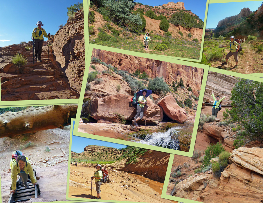 The top photos and middle -bottom photo are at the beginning to middle of the trail, the middle photo is at the waterfall in the previous picture, the LL is Wendy coming up the ladder at the Ruins, the LR is a "wendy" as we are making our way up the hill toward the TH.