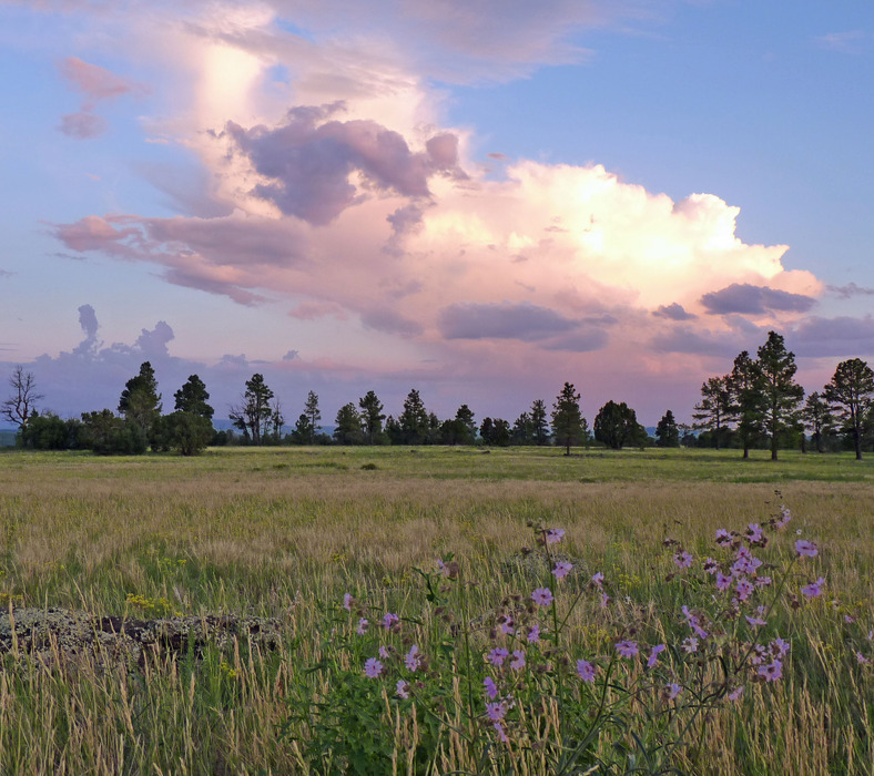 I thot this was a beautiful scene with the purple flowers in the foreground and the pinkish/purplish hues in the background.