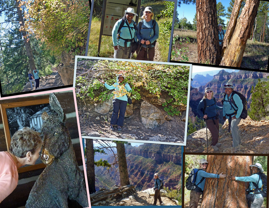 Top row: Tracy & Ambika on the N Kaibab, Tracy & Ambika at the Widforss TH, Ambika between a double tree trunk. Middle photos: Ambika trying to be part of a maple bush, Tracy & Ambika along the Widforss Trail. Lower photos: me rubbing noses with Brighty, Tracy along the Widforss Trail, Tree huggers - Tracy & Ambika.
