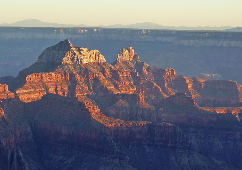 I don't know how some people get such crisp shots of the canyon at sunset but I didn't seem to have that knack. Nonetheless I like this and with those small little mountains across the way.... well not so small (Humphreys at 12,633 feet to the left) but from this distance, they sure seem small. (Brahma and Zoroaster Temples - l to r)