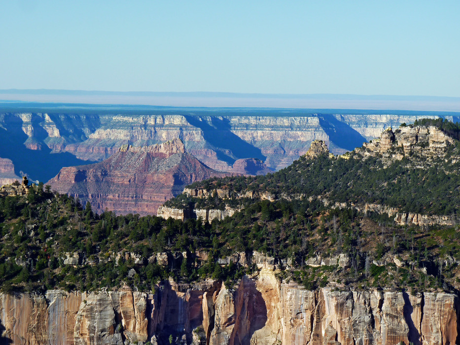 A view of the Coconino sandstone layer (wall) with the Toroweap layer next topped off by the Kaibab limestone layer. I don't know what the somewhat pointed rock formation is on the right side of the photo... Widforss Point? anyone? nor the formation in the left center of the photo... Hiller's Butte?