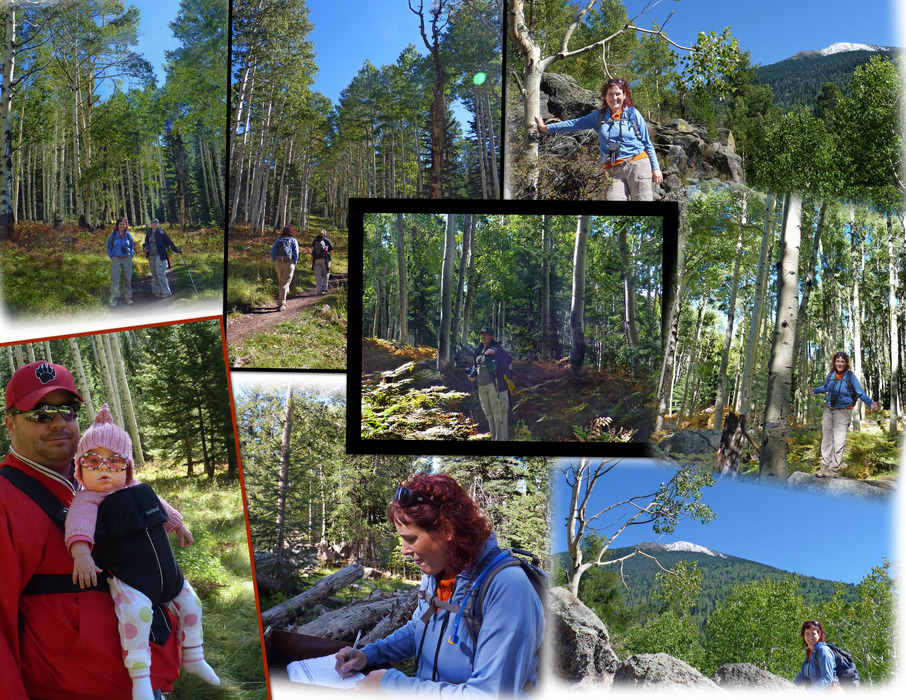People photo collage (most photos of Cindy and Jody). Bottom left corner: I loved this cute little girl with her rockin' sunglasses. I asked permission to take a picture... proud daddy and his little girl out on a Fall hike. And now that I'm looking at the photo of the little girl; I recall getting looks like that from my niece when she was that age, ha! The top and bottom right photos are from the rock area we climbed looking for the trail.