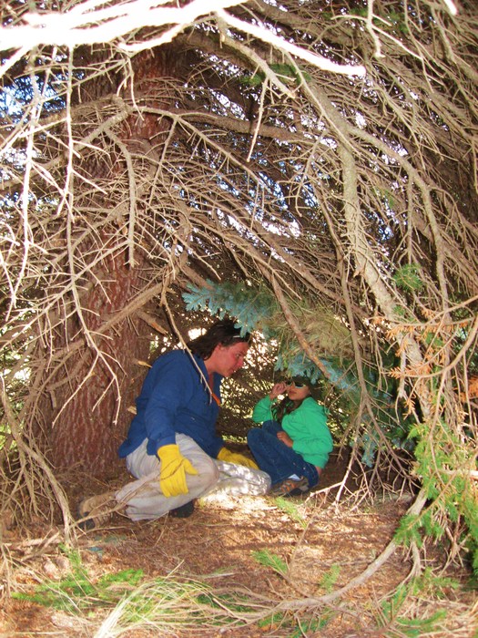 Teaching my niece easy survival skills of making uses of natural shelters and how to improve them to stay alive using very little enegry to make them.