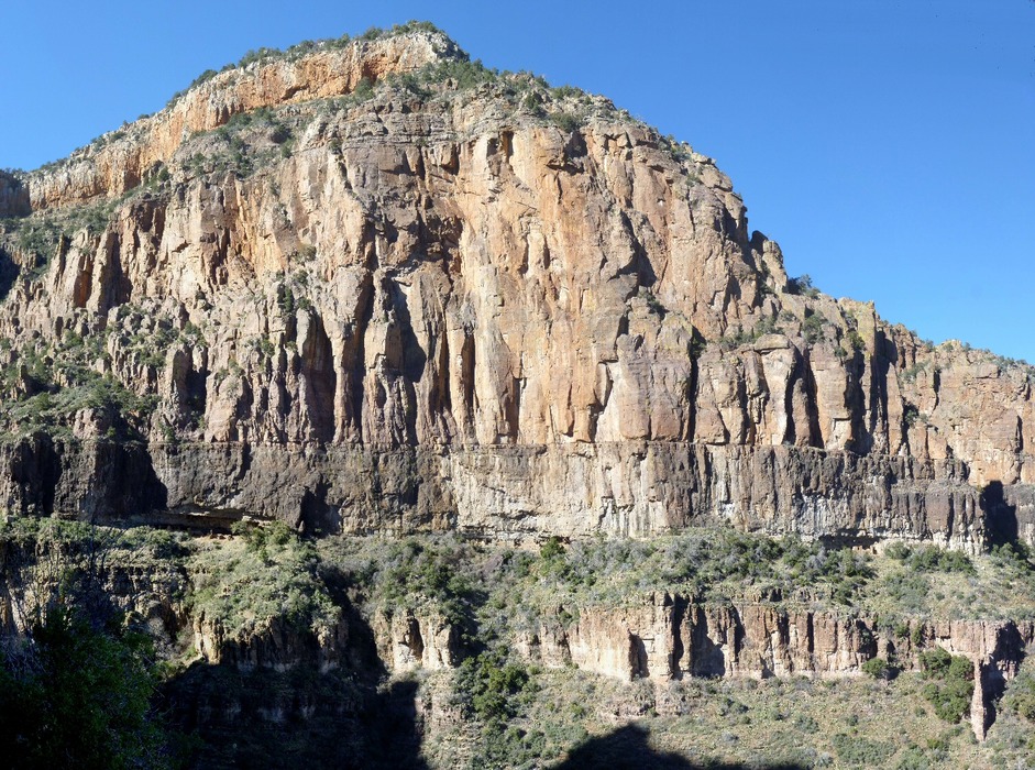 The north wall of Pueblo Canyon as seen from the south wall. Three sets of ruins are visible all just above the vegetation belt (about 1/3 up from the bottom) and below the rock face at the top