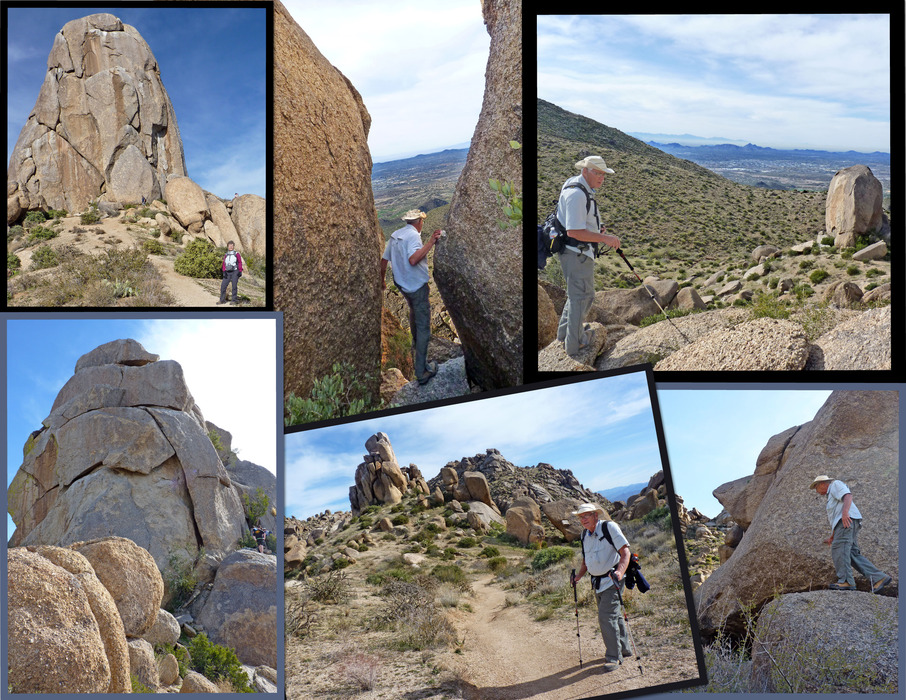 Upper Left: me and the Thumb. Lower Left: climbers on the west side of the Thumb. Upper Middle: John checking out the path you can take to get west of the Thumb. Lower Middle: John on the trail before crossing under the boulders as we head back (east). Upper Right: John looking down toward the trail coming up from the west. You can see downtown Phx from here as well. Lower Right: John coming around the front side of the boulder formation we climbed through and walked around.