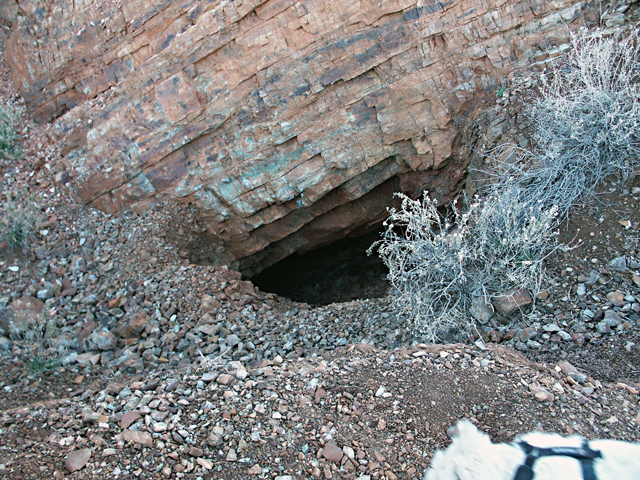 Small dig at the Bombay Mine. Notice the minerals on walls and ground.