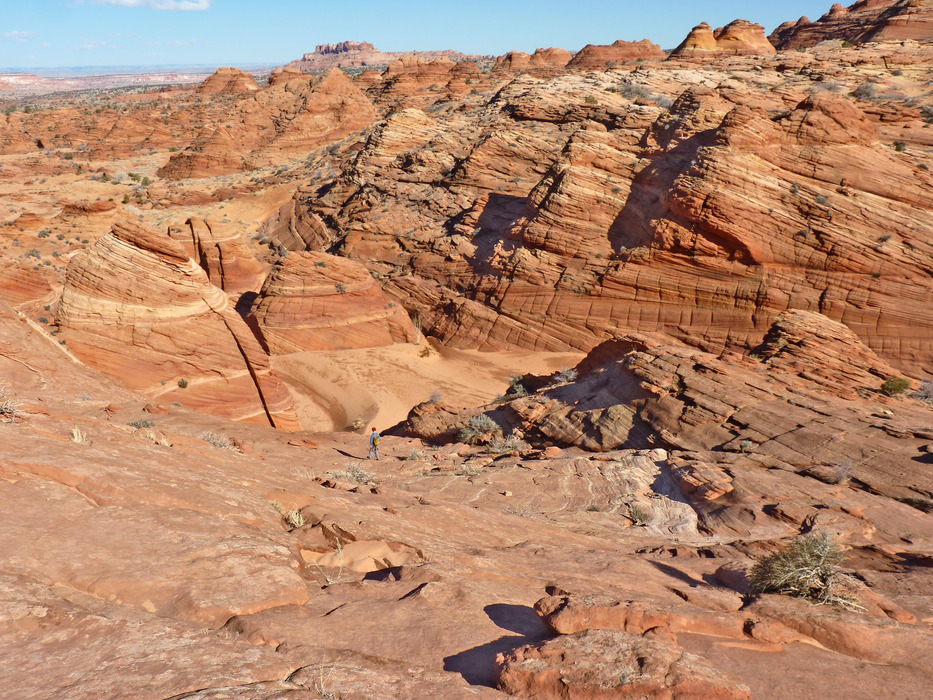 Looking down at Sarah as she tried to find us a way to get down to the sand-duned wash area below her. We were now in pursuit of Wave2. However, we learned that we needed to stay at THE Wave and make our way west and we would have run into it.