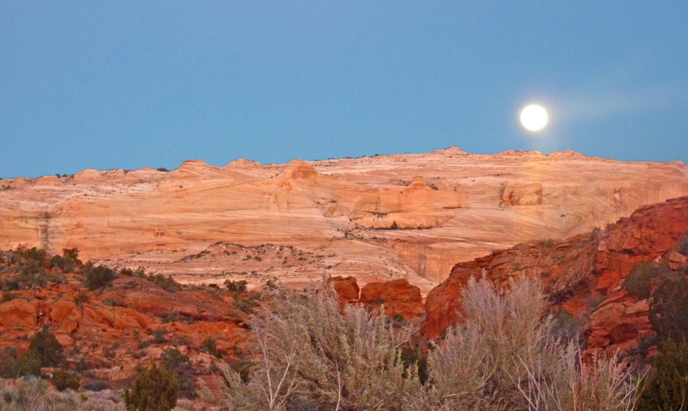 And to cap off what was already a most incredible day in my hiking life, we were greeted by this as Wendy drove around a corner. Unfortunately, it was late and we were cold so we didn't spend too much time photographing this. The moon really was much larger and the dark areas were very prominent though you can't tell that by this photo.