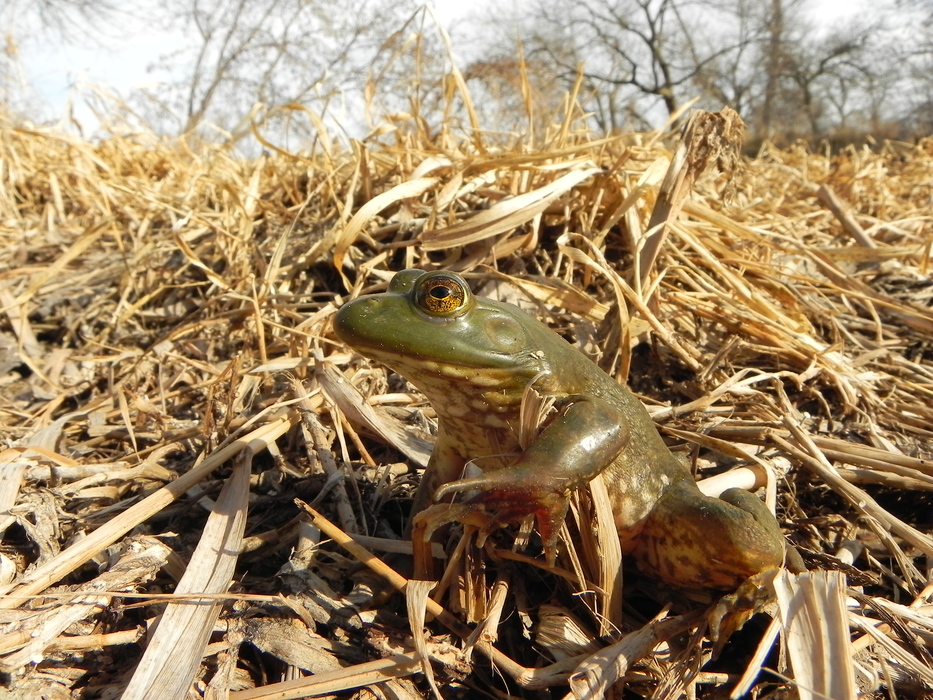This frog is still alive. It was still breathing while I took photos and video, but looked frozen. I wanted to touch it, but when I reached out to, it hopped into the water! It is kind of amazing how they survive winter.
